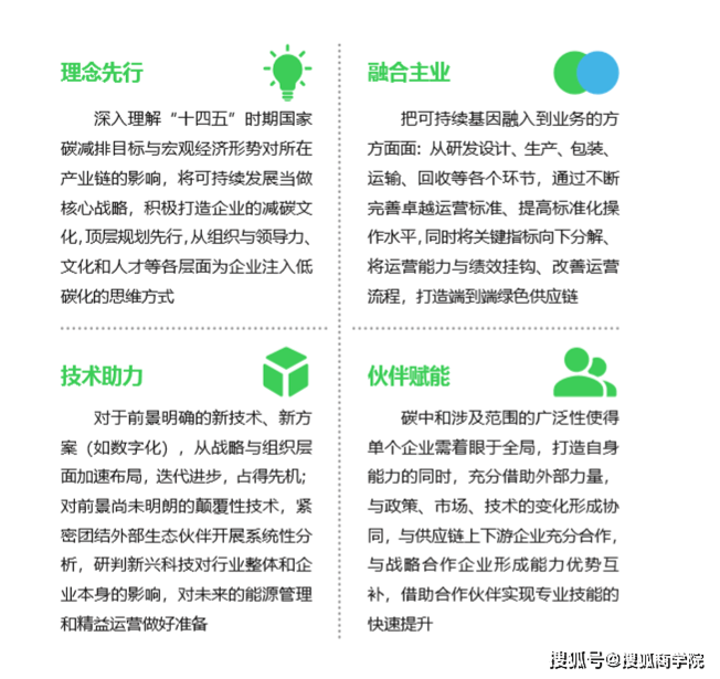 企业该如何为双碳及可持续发展目标的达成做好准备?如何能真正受益于此,获得更高的收益产出?基于调研结果以及对影响行业的多种因素进行分析后,该报告指出答案在于以下四个关键成功因素:理念先行、融合主业、技术助力、伙伴赋能。